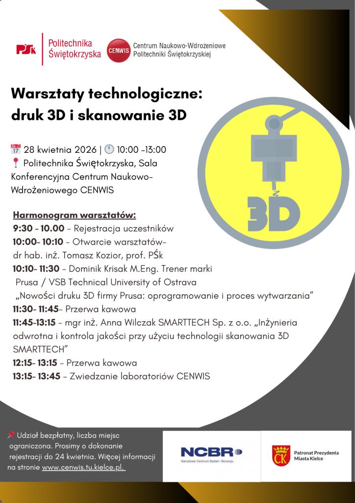 Centrum Naukowo‑Wdrożeniowe CENWIS Politechniki Świętokrzyskiej zaprasza na bezpłatne warsztaty technologiczne poświęcone drukowi 3D oraz skanowaniu 3D, które odbędą się 28 kwietnia 2026 roku w godzinach 10:00–13:00 w sali konferencyjnej Centrum Naukowo‑Wdrożeniowego CENWIS na Politechnice Świętokrzyskiej.